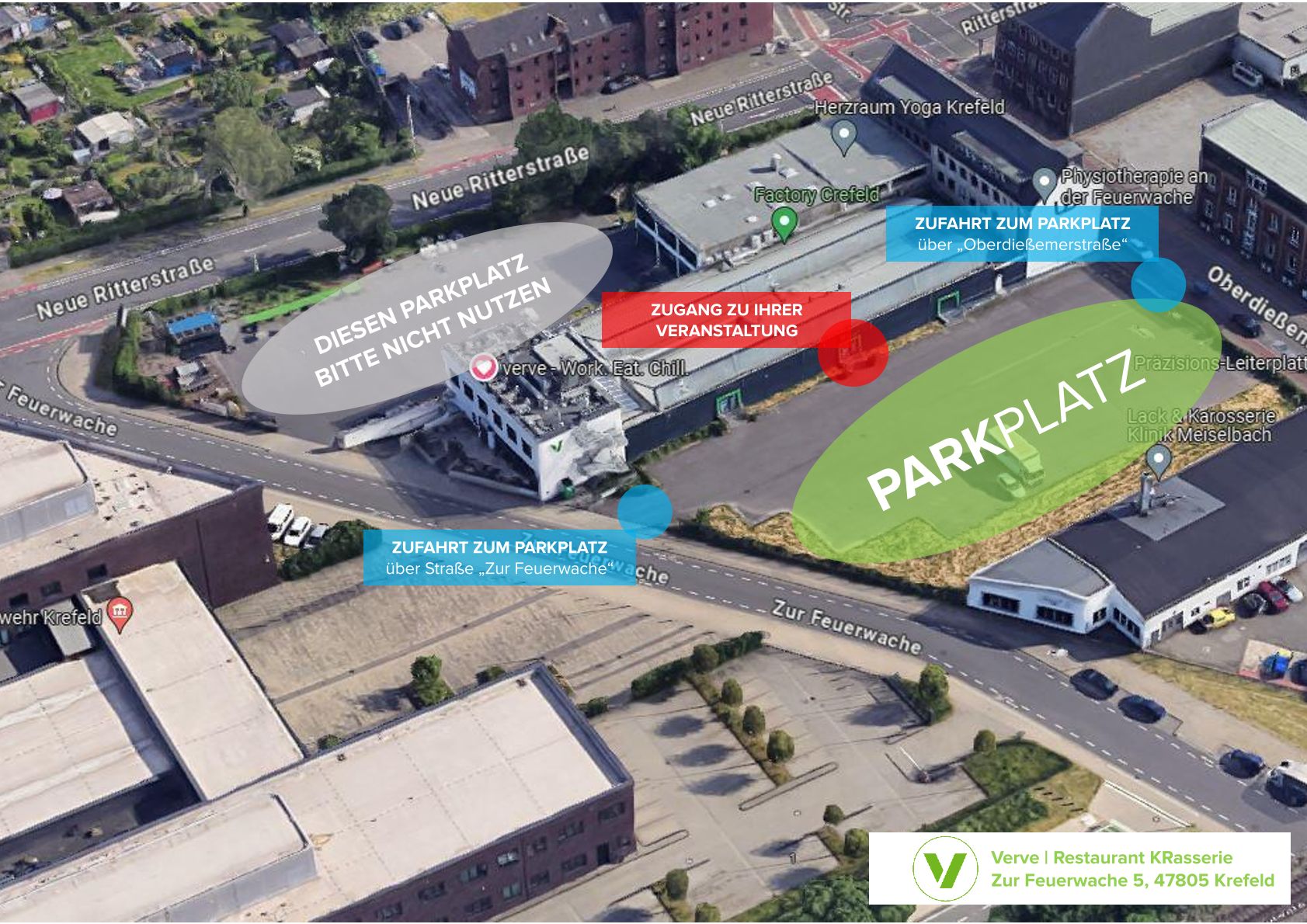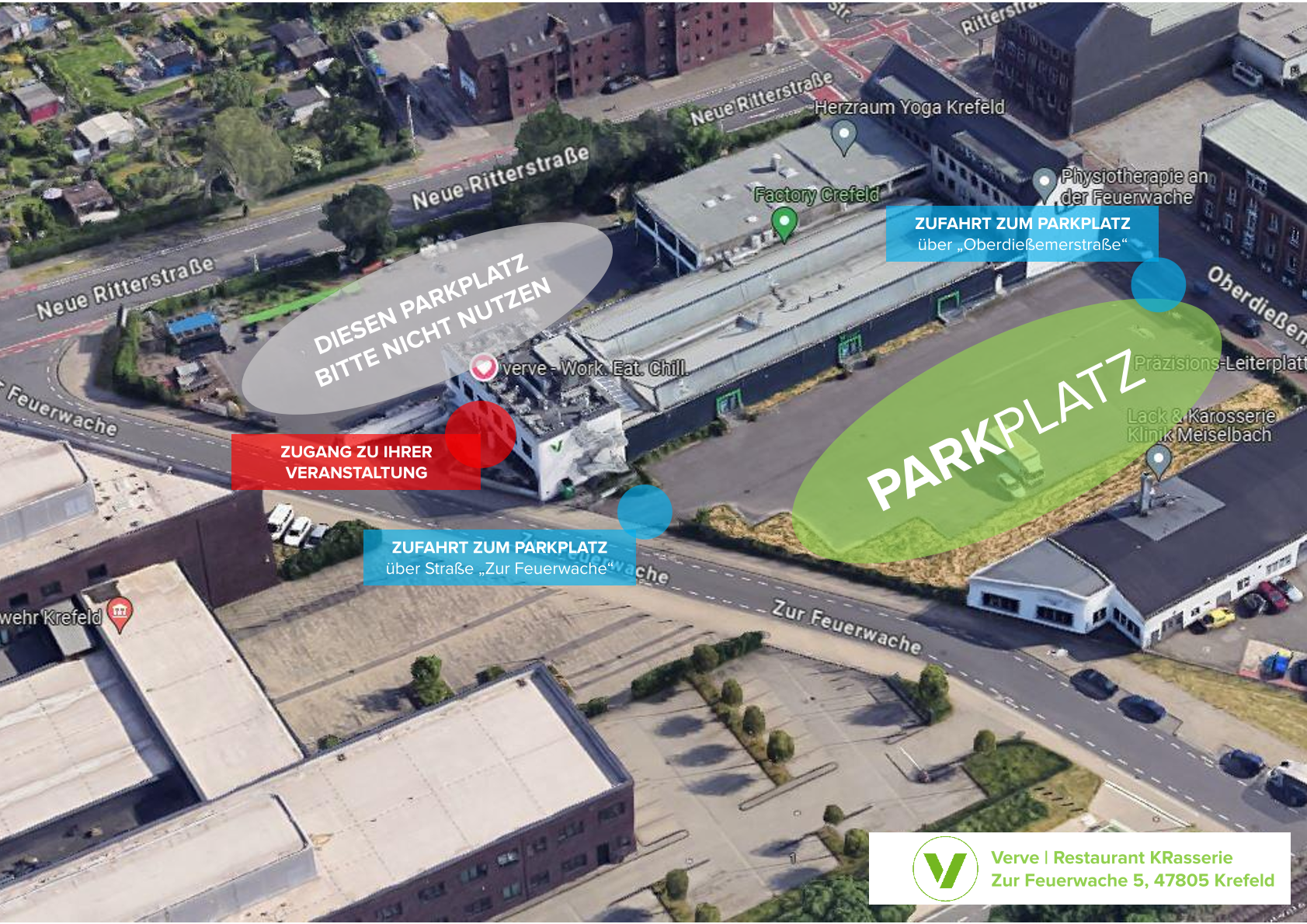 Für die Maschinenhalle | Weberei | Atelier erfolgt der zentrale Zugang über die Verve Erlebniswelt (mittlere Türe auf dem großen Parkplatz).